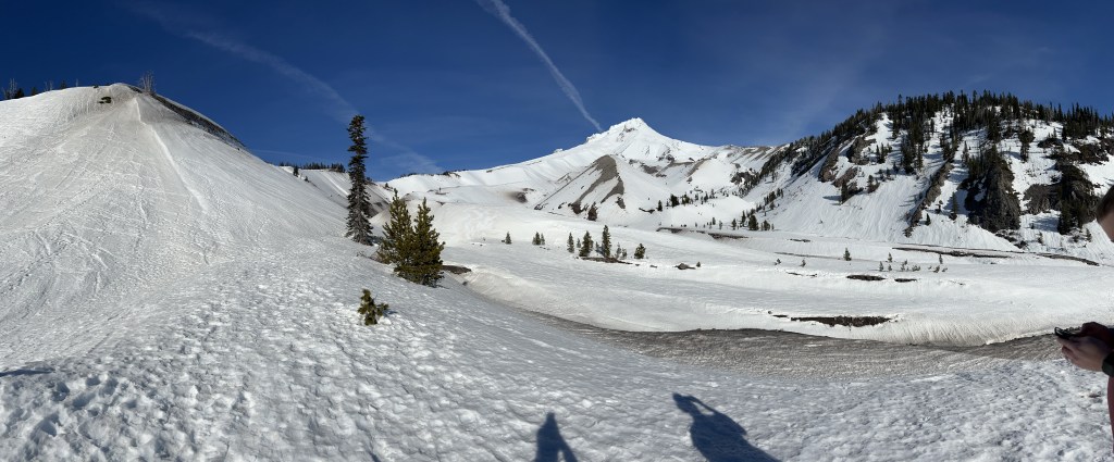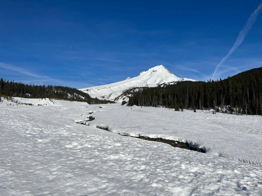 It was unlike any mountain hike I’ve previously done. The slope was visible to the naked eye, but never taxing. The trail disappeared and sprouted curving whiskers constantly, as hikers, snowshoers, and nordic skiers blazed their own routes up the ridge. It didn’t matter, though. We kept the mountain peak in front of us, the higher ridge with its steep sides to our left, and the increasing steeper drop down to the river on our right. Other than that, it was just a matter of avoiding the tree wells created by the sparsely spaced Douglas firs, an easy-enough task. We ambled slowly upward, taking the time to enjoy our wide-open surroundings and the crystal clear sky. The sun was bright and warm at our backs, and we had to shed layers several times before finishing our first mile. At about that point, I think we both realize simultaneously that we hadn’t packed (or applied) sunscreen. A wide open sky and bright snow all around us was definitely a recipe for sunburn, especially on my fair skin. What could we do now, though? Nothing for it but to keep moving.
