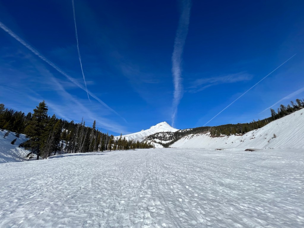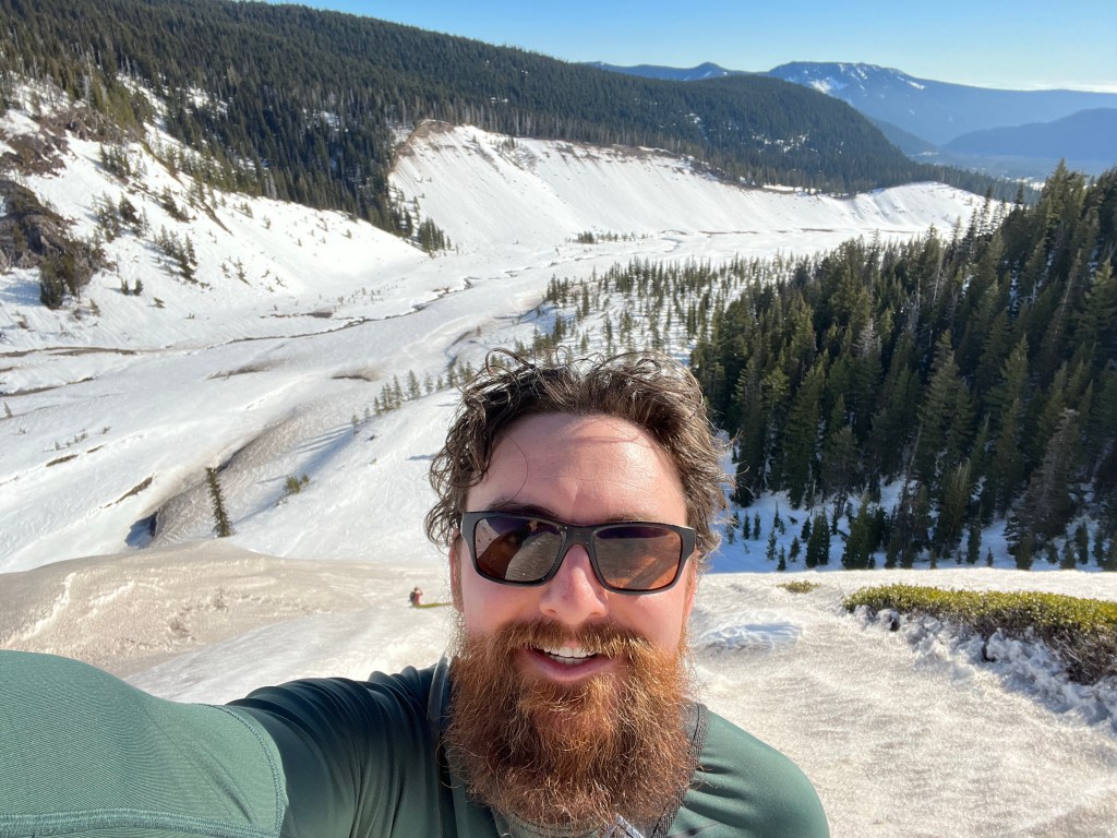 Directly ahead of us was a significantly steeper grade, and no clear trail. The slope was entirely exposed, and whatever previous adventurers had done to summit it was obscured by thaws and gravity. It seemed there were only two options: cut our own precarious switchbacks across the steep face or take the challenge head-on (literally!). Being the more nimble, I took the lead with some short switchbacks. It was a challenge to cut ledges into the hard snowpack, and since the snowshoes and poles were back in the car I had to trust my new traction spikes to grip and keep my balance. It was much slower going, and I had to rest frequently to catch my breath. As the end came closer, I switched directions more quickly until I finally decided to just scramble straight for the top. The snow was shallower as I ascended (thanks, gravity!), making it warm more quickly (hooray for thermodynamics!). The warmer snow offered less traction and a higher likelihood of breaking through the still waist-deep crust. I made it to the top but had to immediately sit down before my heart jackhammered out of my chest.